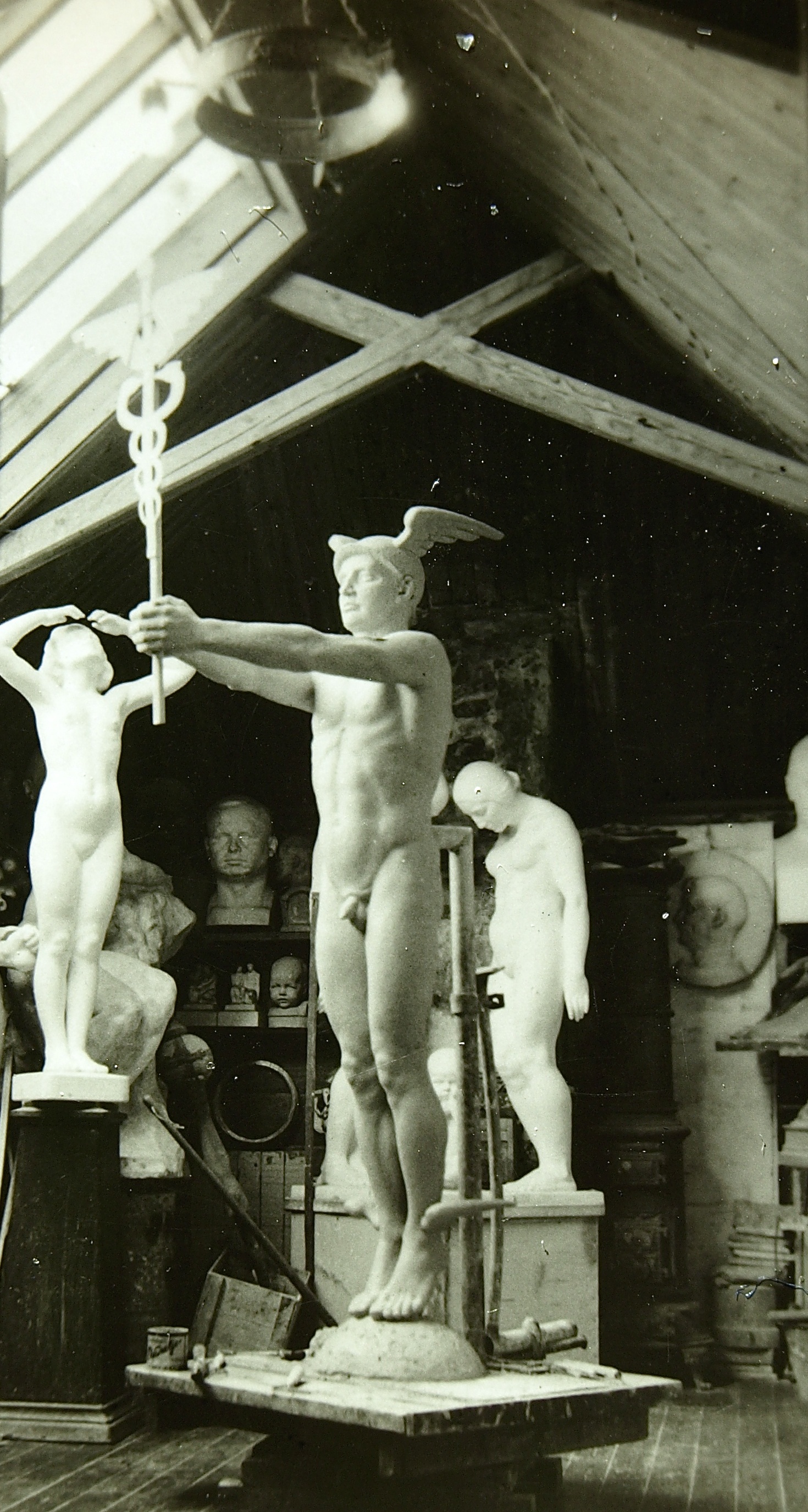 Triumferende holder den romerske gud frem sin Carduceusstav. Handelsguden Merkur ble av Madsen gjort til bergenser, ikke så unaturlig tatt i betraktning byens lange historie som handels-knutepunkt.